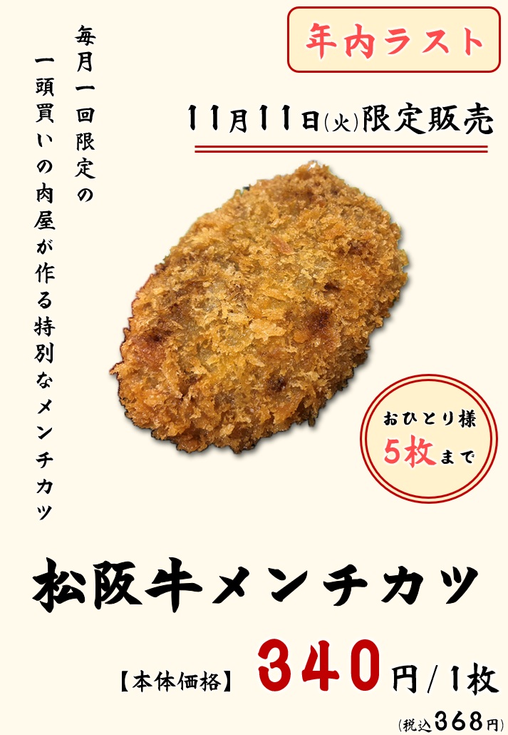 松阪牛メンチカツ【11月11日(火)販売】 投稿日:2025年11月10日(月) いつもミートプラザニシジマにご来店いただき、ありがとうございます。 11月11日(火)松阪牛を使った贅沢なメンチカツを限定販売いたします😊 【限定】松阪牛メンチカツ【本体価格】340円/1枚(税込368円)松阪牛100%の極上メンチカツです!手作りのため製造数量が少なく、お一人様5枚までとさせていただきます🙏ご了承の程宜しくお願い致します。 「BS-TBS サンド伊達のコロッケあがってます」にて、サンドウィッチマンの伊達さんにもお召し上がりいただいた品です! 「ヒルナンデス!」にてご紹介いただいたメンチカツです! スタッフ一同、美味しいお肉をご用意して、ご来店を心よりお待ちしております!
