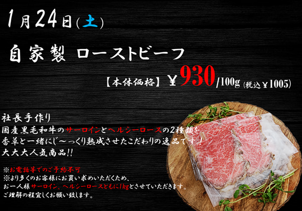 ブロック肉のまま香辛料と一緒に漬け込み、熟成させたこだわりの品です。低温で6時間かけ、じっくり焼き上げた、とろける極上のローストビーフをぜひお試しあれ!