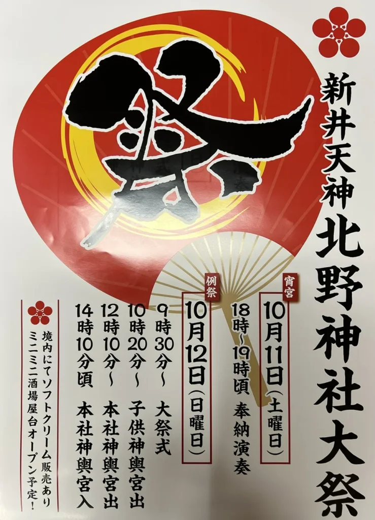 毎年9月に行っていた新井天神北野神社大祭ですが、今年は10月11日(土)12日(日)に変更となります!今年は本祭りだそうです😊