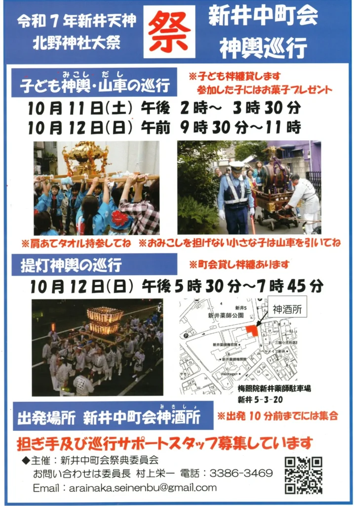 新井中町会では、子供みこしと山車、大人みこしが出ます!新井地区にお住まいでない方も、はんてんを借りて(無料)参加可能です😊