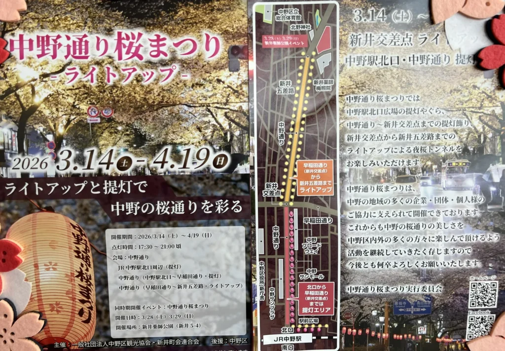 3月14日(土)より中野通りでは桜のライトアップが✨